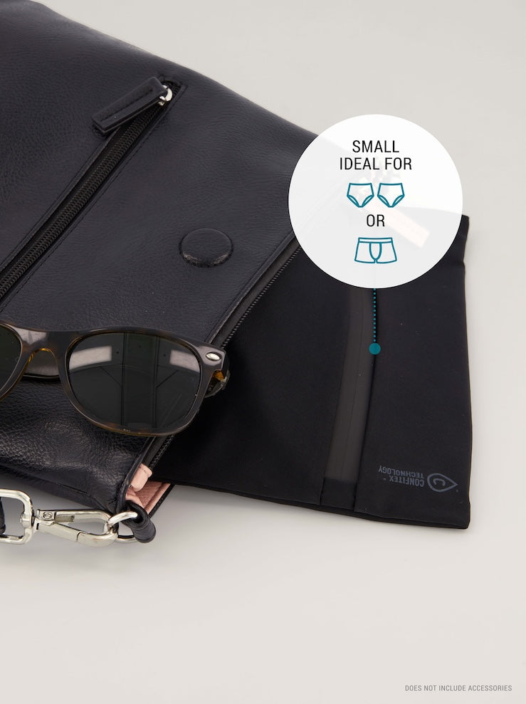 Don’t leave home without a spare pair of absorbent underwear! Our sleek modern wetbag is purpose designed to make it easy to keep a spare pair handy – and bring your laundry home again. Pop a clean pair inside before you leave the house, and if you do need to do a quick swap while you’re out and about, the leakproof wetbag lining will make sure your used pair gets home safely and discreetly. They’re also great for travelling. Wave goodbye to scrunchy plastic bags in your briefcase, handbag or luggage!